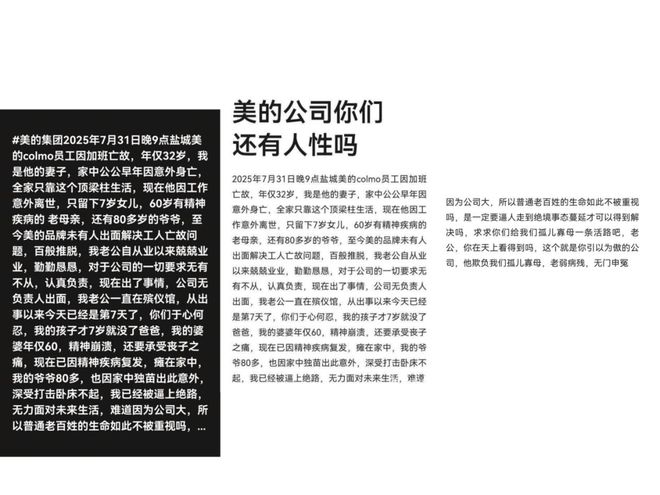 2025年7月31日晚9點鹽城美的colmo員工因加班亡故,年僅32歲,我是他的妻子,家中公公早年因意外身亡,全家只靠這個頂樑柱生活,現在他因工作意外離世,只留下7歲女兒,60歲有精神疾病的老母親,還有80多歲的爺爺,至今美的品牌未有人出面解決工人亡故問題,百般推脱,我老公自從業以來兢兢業業,勤勤懇懇,對於公司的一切要求無有不從,認真負責,現在出了事情,公司無負責人出面,我老公一直在殯儀館,從出事以來今天已經是第7天了,你們於心何忍,我的孩子才7歲就沒了爸爸,我的婆婆年僅60,精神崩潰,還要承受喪子之痛,現在已因精神疾病復發,癱在家中,我的爺爺80多,也因家中獨苗出此意外,深受打擊卧牀不起,我已經被逼上絕路,無力面對未來生活,難道因為公司大,所以普通老百姓的生命如此不被重視嗎,是一定要逼人走到絕境事態蔓延才可以得到解決嗎,求求你們給我們孤兒寡母一條活路吧,老公,你在天上看得到嗎,這個就是你引以為傲的公司,他欺負我們孤兒寡母,老弱病殘,無門申冤。