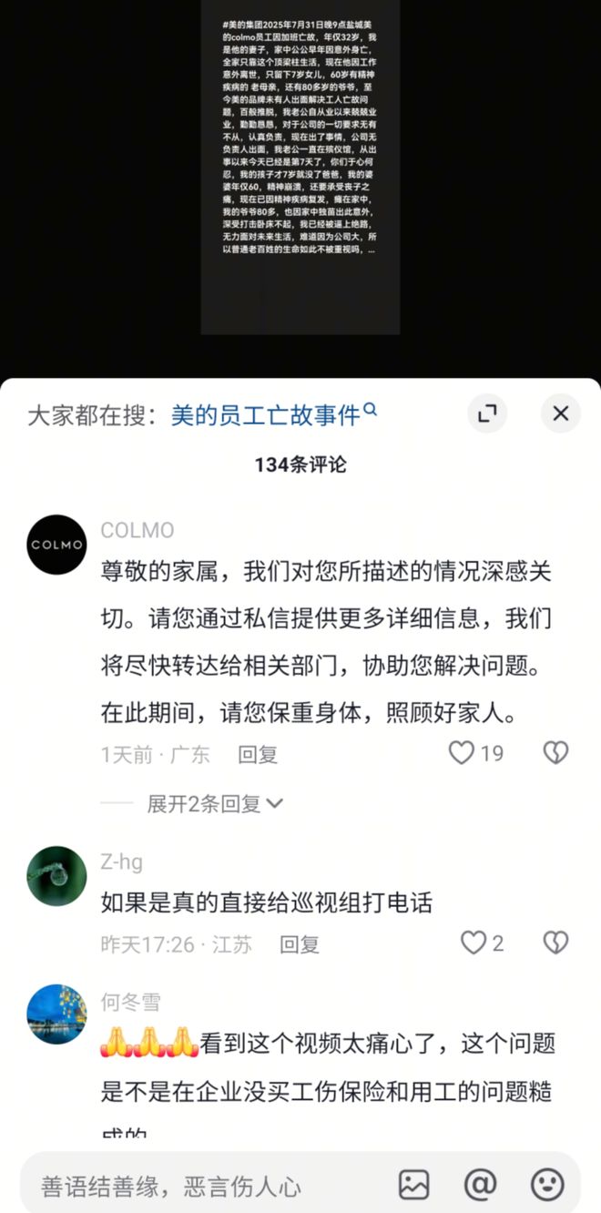 8月7日,有網友在抖音等社交平台爆料稱,自己丈夫在美的集團COLMO鹽城工作,因加班亡故,年僅32歲。COLMO官方抖音賬號在其評論區回應稱,對此深感關切,將協助解決問題。