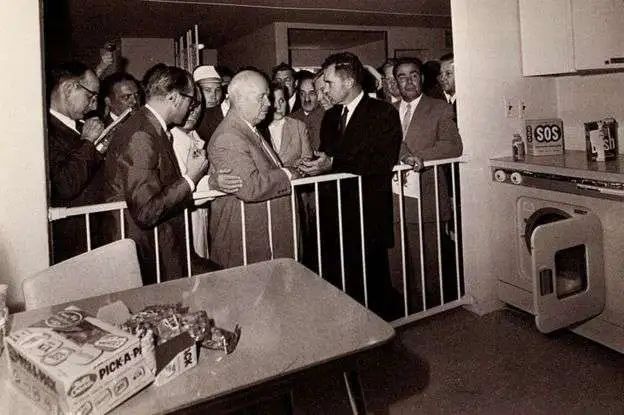1959年7月24日,在莫斯科舉行的美國國家博覽會開幕式上。大漂亮副總統理尼克松和紅鵝部長會議主席赫魯曉夫,在廚房用具展台前進行辯論哪個國家會贏得未來的勝利。