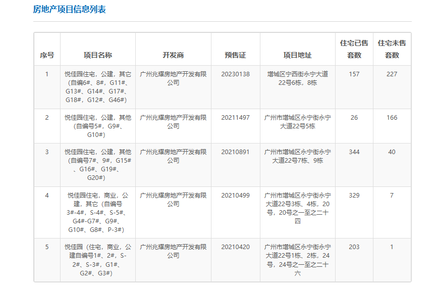 實現超70%的去化率,廣州悦峯花了4年多時間,最早拿預售證時間為2021年4月;最近一次拿證是2023年1月,即6棟、8棟合計384套房源,目前去化率為40.9%。