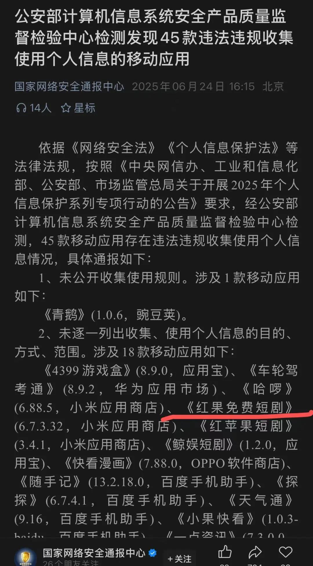 6月24日,國家網絡安全通報中心發佈消息,公安部計算機信息系統安全產品質量監督檢驗中心檢測出45款違法違規收集使用個人信息的移動應用,其中便包括紅果免費短劇app。