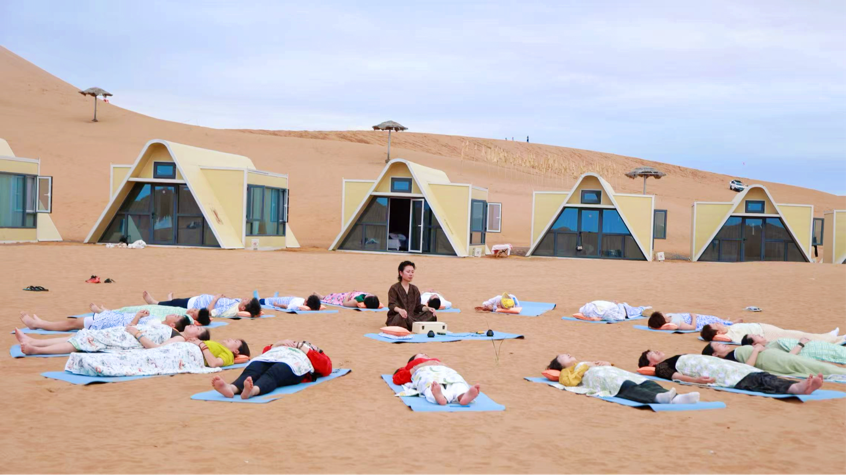 夜幕降臨,沙漠腹地的“音藥療愈”更顯獨特。參與者躺在細沙支撐的瑜伽墊上,聆聽自然之音與療愈頻率的共鳴,晚風與星空消解了都市喧囂。正如摩天輪智美集團董事長瞿承霞所言:“健康不僅是強健體魄,更在於心靈平靜與自然歸屬感,這是‘三健康’理念的核心。”