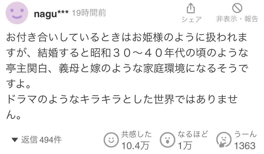“在交往時會被像公主一樣對待,但一旦結婚,就會變成昭和30~40年代那種夫權主義、婆媳關係緊張的家庭環境。