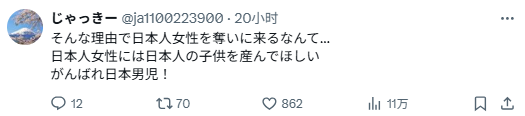 竟然因為這種理由來搶日本女性……我希望日本女性能為日本人生下孩子。加油啊,日本男兒!