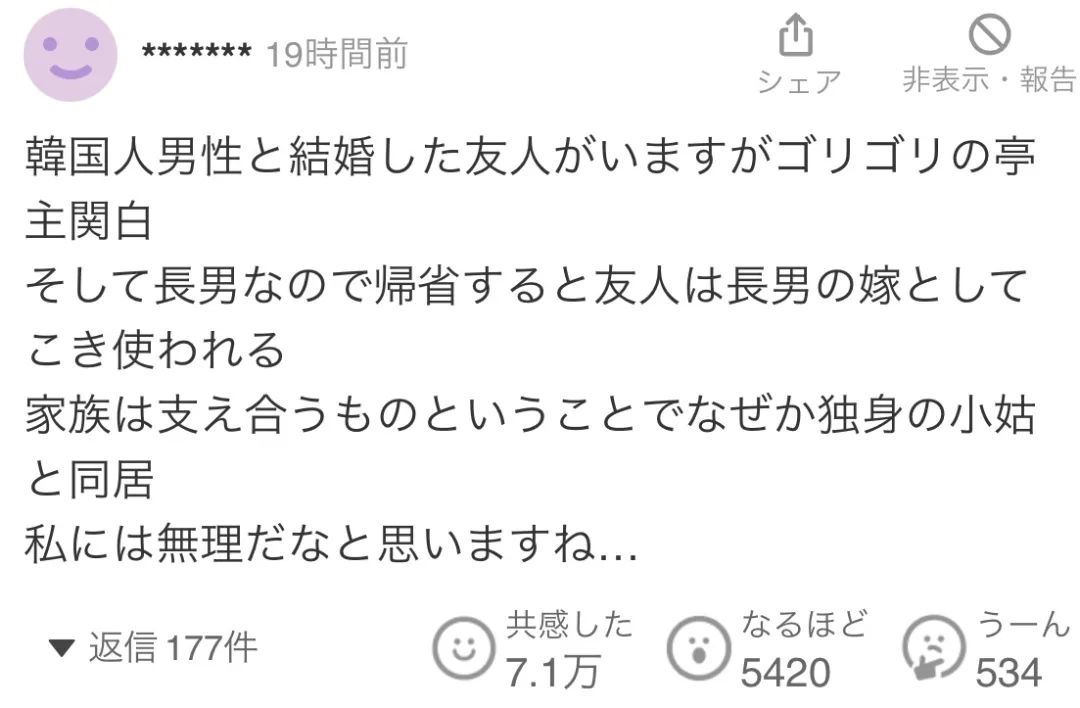 “我有一個和韓國男性結婚的朋友,但她的丈夫是徹頭徹尾的大男子主義型。
