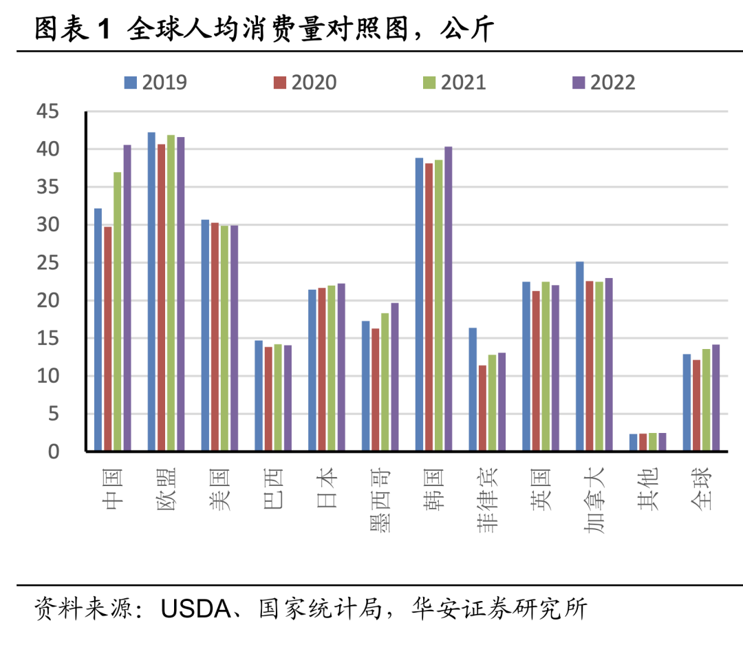 從人均來看,,當代全球人均消費量大概是13公斤/年,但中國人每年吃掉的豬肉已經跳到了40公斤/年,這和歐盟國家處於同一水平,最多也就這樣了。