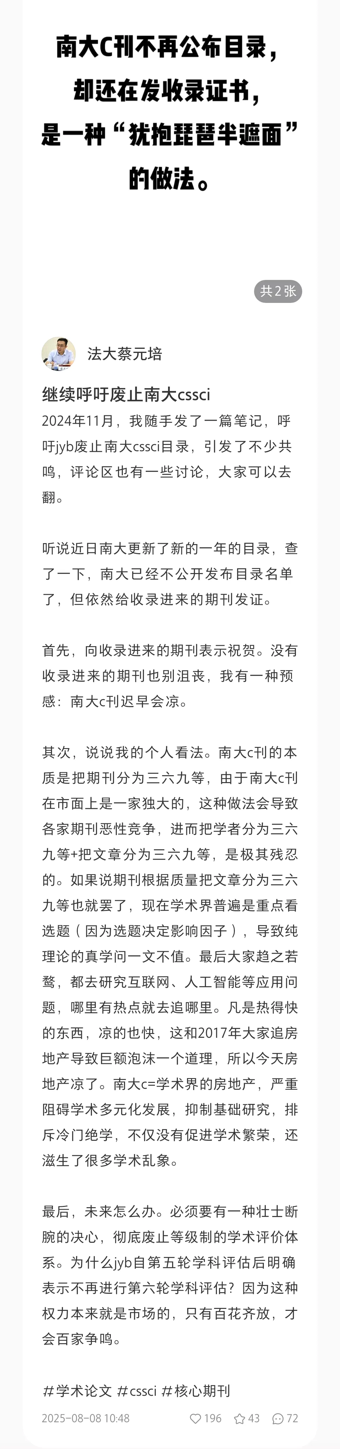 2025年8月8日,蔡老師又在小紅書發文《繼續呼籲廢止南大cssci》: