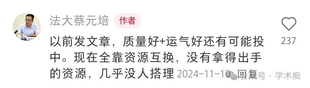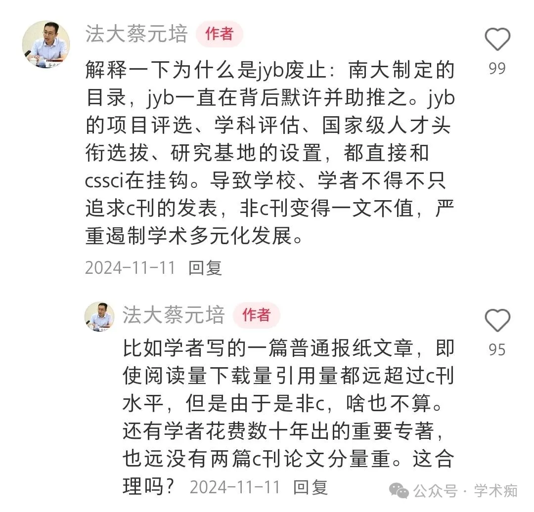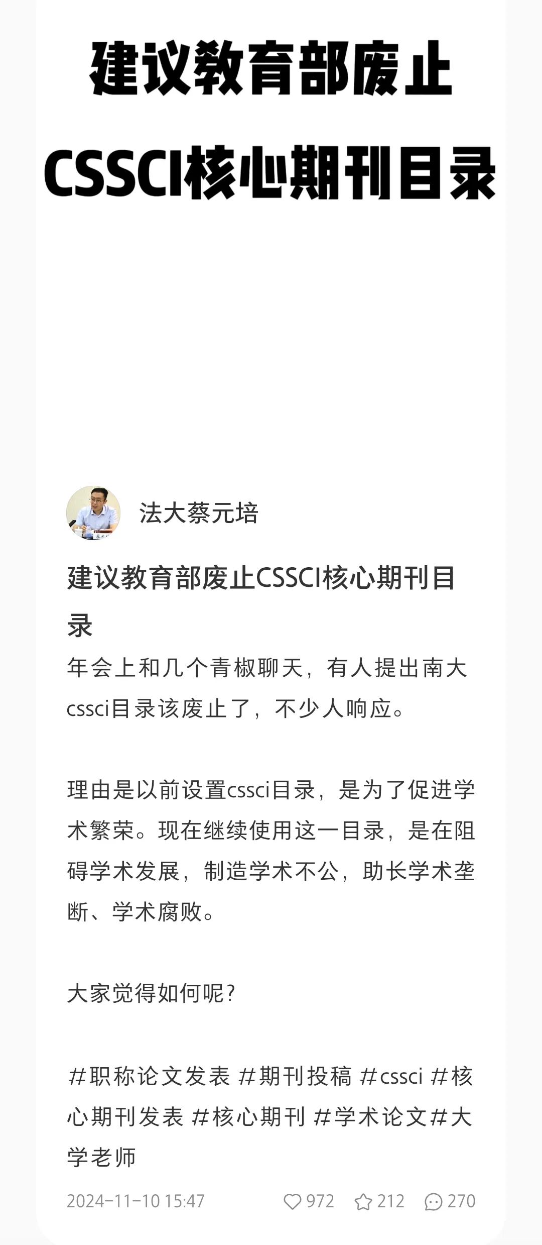 2024年11月11日,中國政法大學刑事司法學院蔡元培老師在小紅書賬號“法大蔡元培”上發文《建議教育部廢止CSSCI核心期刊目錄》: