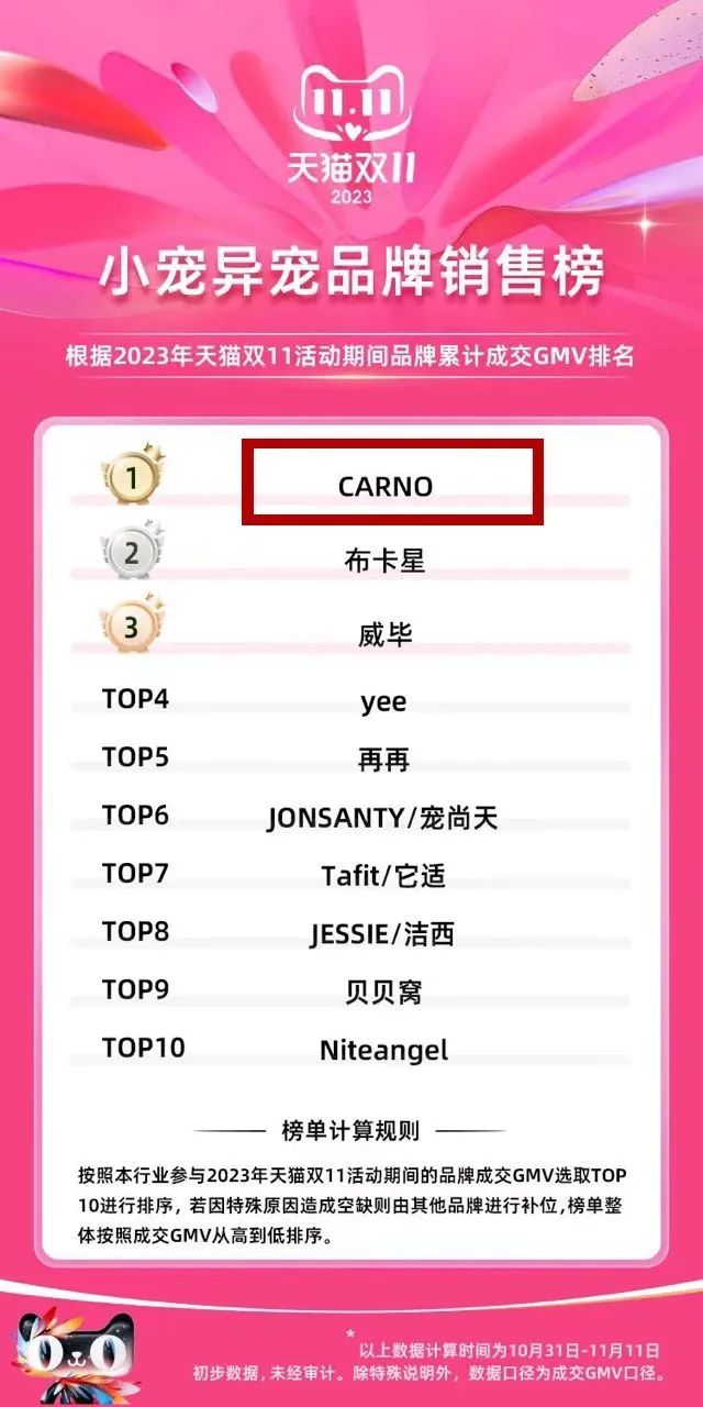 到了2023年,卡諾的銷售額一舉突破4億元,在天貓雙11小寵異寵類目品牌銷售榜中拔得頭籌,同比增長280%,其中天貓成交額佔比70%,抖音佔比20%。如今,卡諾的SKU數量多達上千個,成為了天貓小寵細分類目當之無愧的頭部品牌之一,年均銷售額突破1億元。