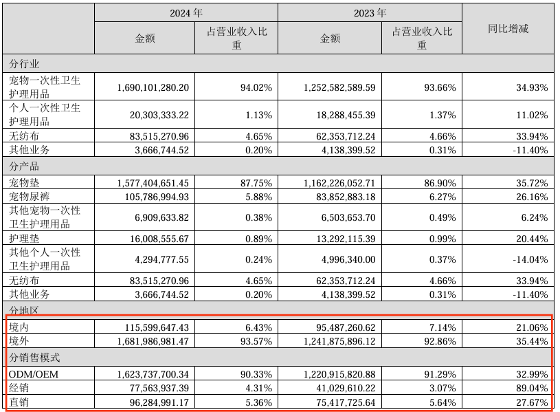 值得注意的是,依依股份的業績增長也得益於其深耕全球寵物護理市場的戰略佈局,依依股份產品出口佔比超過90%,主要面向美國、歐洲、日本等發達國家和地區。分地區來看,依依股份境外營收16.81億元,佔總營收93.57%,增長35.44%;境內營收1.15億元,毛利率20.79%,佔總營收6.43%,增長21.06%。分銷售模式來看,依依股份ODM/OEM營收16.23億元,毛利率20.60%,佔總營收90.33%,增長32.99%;經銷模式營收7756萬元,增長89.04%;直銷模式營收9628萬元,增長27.67%。
