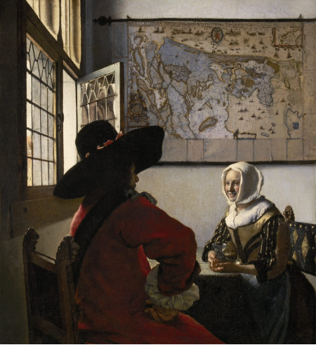 約翰內斯・維米爾的《軍官與笑顏少女》(約 1657 年)—— 這幅畫描繪了劇院包廂裏的一位年輕女子與一名士兵,定格了兩人打情罵俏或談情説愛的瞬間。女子會心微笑,男子俯身向前,但畫面中誰在主導這段互動,始終曖昧不明。