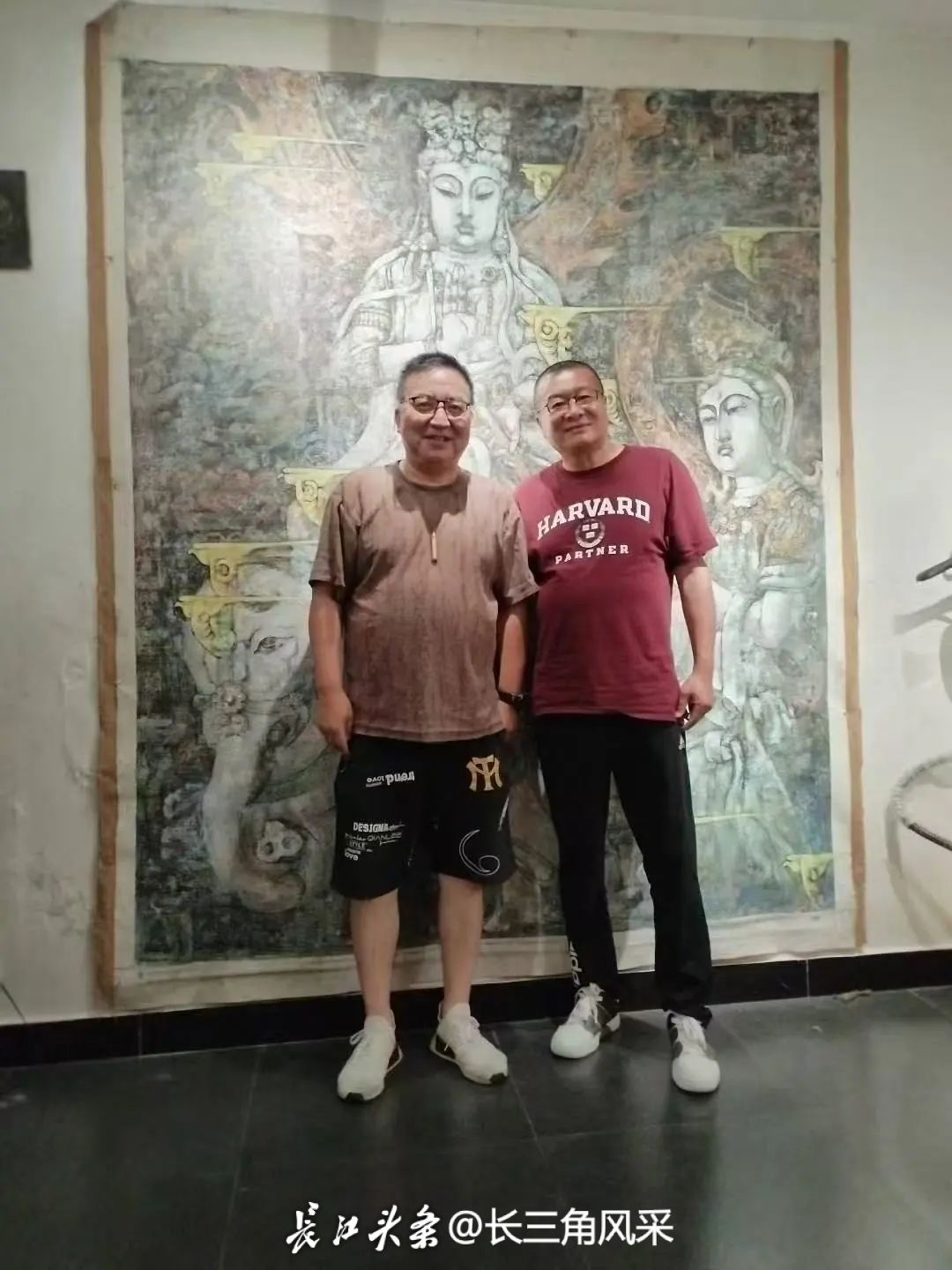 老宅本身,竟成為最懂藝術的“策展人”。東院一扇扇雕花窗欞,竟成了雷震油畫的天然畫框——《廊橋聽雨》中那綿綿不絕的雨絲,與窗外古鎮飄落的細雨竟如此默契呼應;而西廂房那斑駁古舊的老牆,則成了朱者赤版畫的絕佳襯底,版畫上那些金箔在午後的陽光裏微微閃耀,彷彿是從敦煌壁畫上悄然抖落的星辰。兩位老師曾於中院天井駐足良久,雷震先生指着牆角那株虯枝盤曲的百年石榴樹,笑着對朱先生道:“你看這枝椏伸展的弧度,倒與你版畫中飛天那飄逸的絲帶如出一轍。”朱先生凝望着樹影婆娑,在雷震的《古鎮暮色》上搖曳生姿,頷首道:“想來江南的草木風骨,也藏着與敦煌壁畫一般的氣韻流轉。”