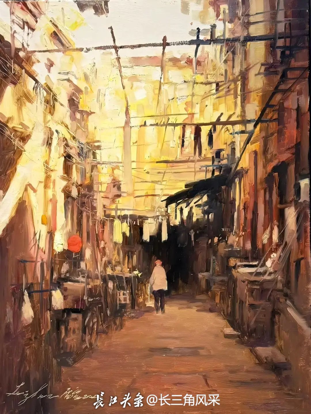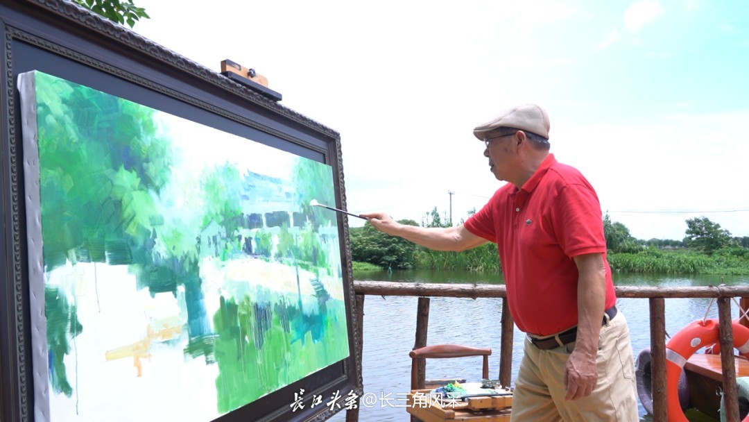 畫裏畫外,流淌着人間煙火最樸素的詩意。雷震的油畫裏藏着黎里人的日常:捶打衣裳的阿婆、倚橋抽煙的老伯、熱氣騰騰的餛飩鋪……展覽當日,畫中那位阿婆端着木盆來了,一眼認出畫中自己的身影,指着角落那隻碎花盆笑得合不攏嘴。