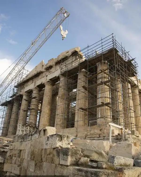從修復史來看,帕特農神廟經歷了從 “修補” 到 “替換”,再到 “聖像化” 的過程。1834-1940 年是國家神話的施工現場,1834 年,巴伐利亞攝政王路德維希下令 “恢復雅典古蹟”,其御用建築師 Klenze 在日誌中直言:“我們將為希臘民族提供一座可見的祖先殿堂”;1925-1940 年,巴拉諾斯團隊共替換 / 移置 42% 的鼓石、78% 的額枋與 90% 的檐口,同期攝影檔案顯示,腳手架包裹下的神廟幾乎被 “拆解成樂高積木”。1950-2024 年則是維護 “贗品” 的合法性階段,1975-2003 年,雅典衞城修復局(YSMA)的主要預算 64% 用於處理鋼筋鏽蝕與水泥開裂;2024 年啓動的 “Phase IV” 計劃繼續使用鈦合金替代 1920 年代鋼筋,官方文件坦承:“目標並非恢復原狀,而是延續 20 世紀結構安全標準”。此外,國際法規存在 “選擇性失明”,儘管《威尼斯憲章》1964 年即已生效,希臘直到 1983 年才批准加入,而巴拉諾斯時期檔案被列為 “國家機密” 封存 75 年,直至 2015 年才部分解密,對比之下,中國在 2003-2022 年故宮太和殿大修中,更換木構件不超過 8%,且所有替換木料均取自明代舊料庫存,全程錄像並向公眾直播。