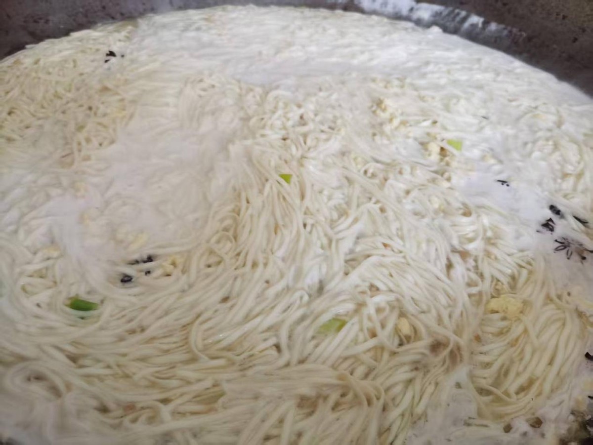 大食堂的早餐和晚餐,手工饅頭是餐桌上雷打不動的標配;中午有時是饃菜湯,有時是手工麪條,全都是用村裏自己種的小麥磨出的麪粉做的。依稀記得剛開始參與淘麥、晾麥、磨麪粉時,因為從沒見過這些流程,總拿着手機拍個不停。以前是自己孤陋寡聞,如今見得多了也就不稀奇了,只知道老人們總説這麪食有小時候的味道,麥香濃郁,吃起來特別筋道。有時還會納悶,明明能買到現成的麪粉,為啥非要費這麼大功夫自己磨麪粉做饅頭呢?直到今天,聽平軍書記和老人們嘮嗑,才總算明白了大姐這番良苦用心。
