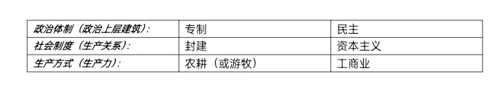 下面就其中的用語作一個説明:一、作為一個馬克思主義術語,“生產方式”曾被用得比較遊移,不過通常多兼指生產力與生產關係,在這裏我們用來指特定層級的生產力。對於“生產力”這一概念如果不這樣加以進一步的框定就容易造成誤解,比如以為它可以指一個經濟體的總產值(如果是這樣的話那麼一個工商業小國的總產值有可能還不如一個農業大國的總產值)。因此我們移用“生產方式”這樣一個術語,在我們這裏它實質上與馬克思所説的生產力是同一個意思,只是問題在於自馬克思以來人們以往似乎並沒有把此“生產力”一語定義得十分清晰。二、“上層建築”這一概念的外延太大,這裏僅取其與生產方式和生產關係銜接最密切的政治層面,具體説就是政治體制(政治體制應該與上層建築的其他領域有所切分,因為在與生產方式和生產關係的銜接上它們具有非常不同的性質,比如文學藝術,就不能認為資本主義時代的作品都比封建時代的作品更高級;還有法律,像英國中世紀的法律體系到今天還可以沿用)。