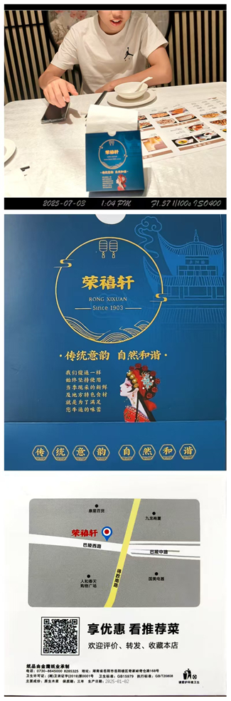 我是一名慕名遊覽岳陽的武漢遊客。昨日(2025年7月3日)祖孫三代於“榮禧軒”酒店用餐時,其餐巾紙盒包裝內容令我們深感震驚,特此反映。