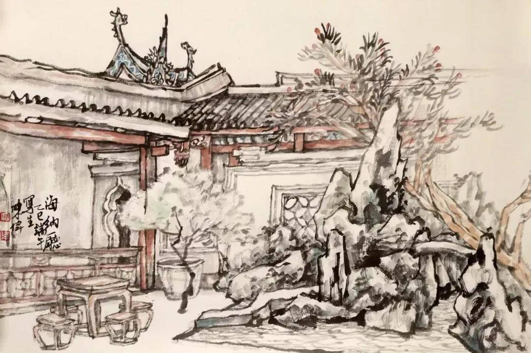 對於迴廊、天井,陳偉更是別出心裁。他以水墨鋪陳空間的深遠,用淺絳區分光影的層次,讓迴廊轉折處藏着“曲徑通幽”的驚喜;使天井的陽光成為畫裏的高光,照亮的不僅是建築,更是沉澱在時光裏的人文温度。他的寫生像是為這些“遺芳幽處”做一場“水墨造影”,將物理空間轉化為淺絳山水裏的精神棲息之所。