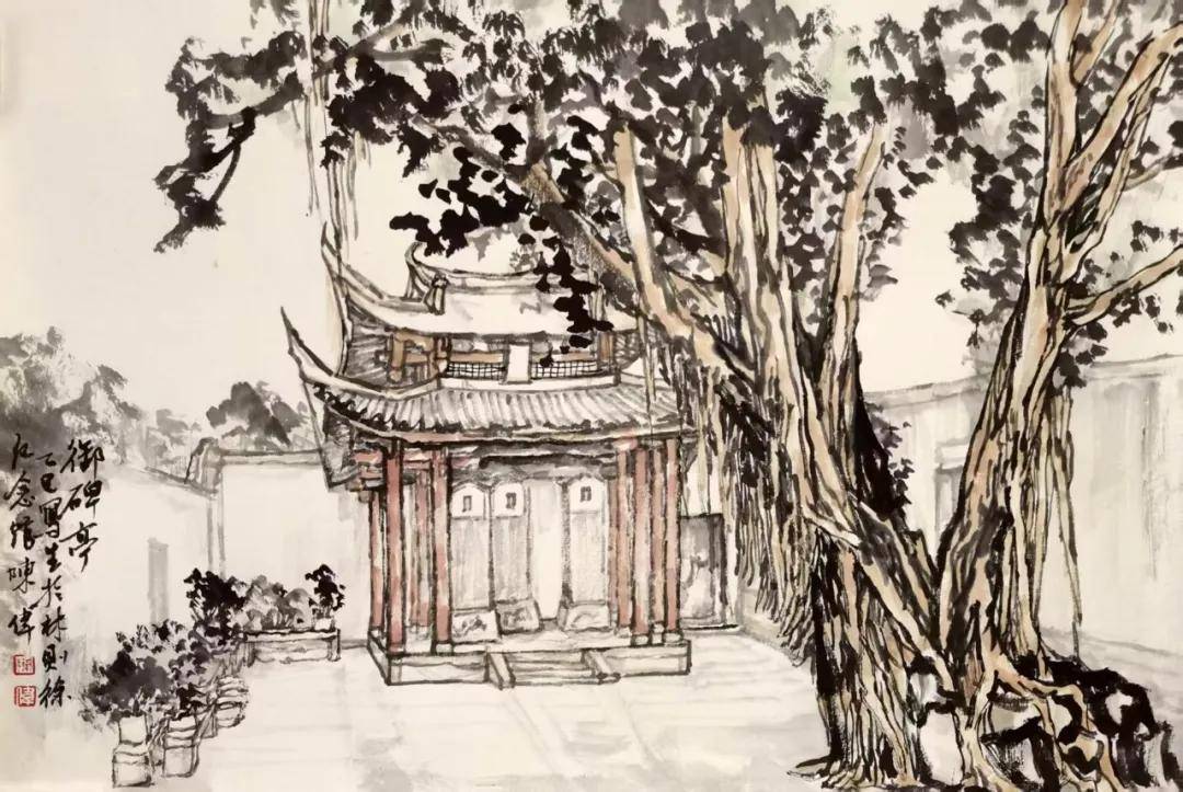 在陳偉的“遺芳幽處”作品中,繪製了林則徐故居、林則徐出生地、鰲峯書院舊址、光祿吟台——林則徐放鶴處、桂齋——林則徐讀書處、禁煙亭、林則徐紀念館等多處與林則徐相關的“遺芳幽處”。當陳偉帶着淺絳山水筆墨走進這些地方,似一場跨越藝術門類與時空的相遇。他摒棄對這些地方的“如實描摹”,以水墨為媒介,捕捉建築與時光交融的剎那詩意。