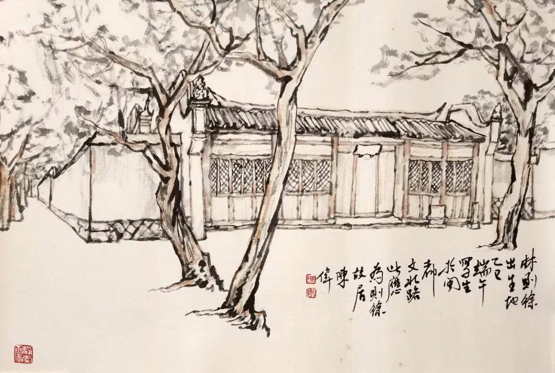 2025年,是林則徐誕辰240週年。在這個有特殊紀念意義的年份,今夏(多幅畫作標註“乙巳端午”),福建畫家陳偉走進林則徐故居、林則徐紀念館、林則徐出生地寫生創作,聆聽青瓦白牆訴説百年風雨,追憶這位民族英雄、世界禁毒先驅。在林則徐故居,從門廳進入,木質結構房屋錯落有致,迴廊曲折間,彷彿能見1785年生於福建侯官的民族英雄踱步思索。這位嘉慶十六年(1811年)進士,以“俟村老人”“七十二峯退叟”為晚號,近40載仕途歷官14省、統兵40萬,卻始終廉潔自律、兩袖清風。庭院古木蒼勁,天井承接朝暉夕陰,曾映照他走向虎門銷煙的果敢——“使數十年後,中原幾無可以禦敵之兵,且無可以充餉之銀”的痛陳,至今振聾發聵。