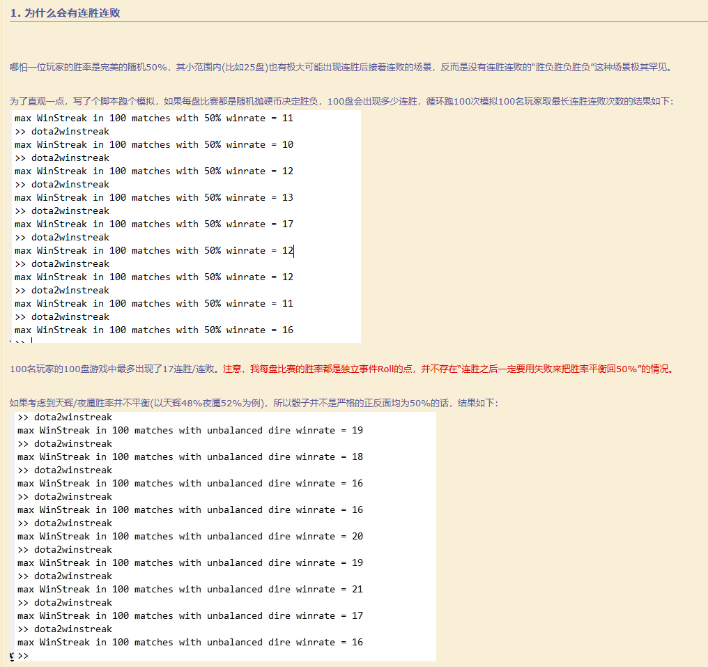 大概四五年前的時候,我在NGA的DOTA2板塊見過一次持續數個月的“V社到底有沒有控制50%勝率”討論,那時有位玩家(@WaterEast)跑了個模型,從數學角度論證了一下“為什麼連勝之後接連敗(以及連敗之後接連勝)都是正常的數學現象”。