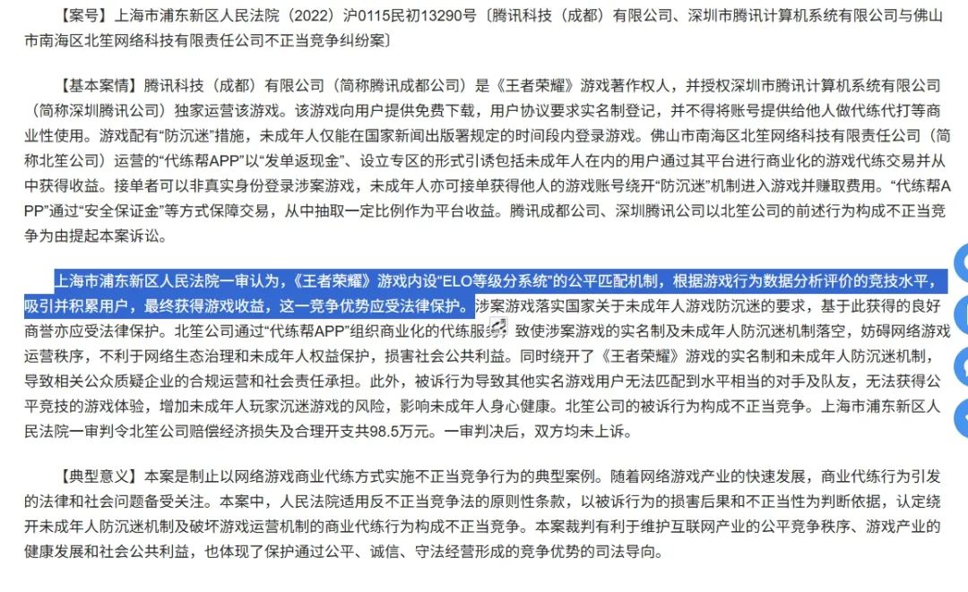 2022年,上海浦東新區法院就有一起涉及《王者榮耀》代練的不正當競爭案,明確認定匹配算法屬於可保護的競爭優勢,代練行為破壞該機制構成侵權。