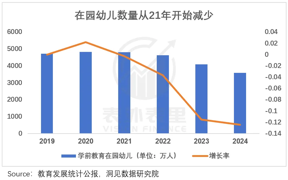 屋漏偏逢連夜雨,幼教行業的“達摩克利斯之劍”也在這時落了下來——“少子化”浪潮,在2021年波及幼兒園,此後在園人數逐年遞減。