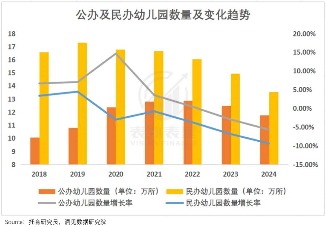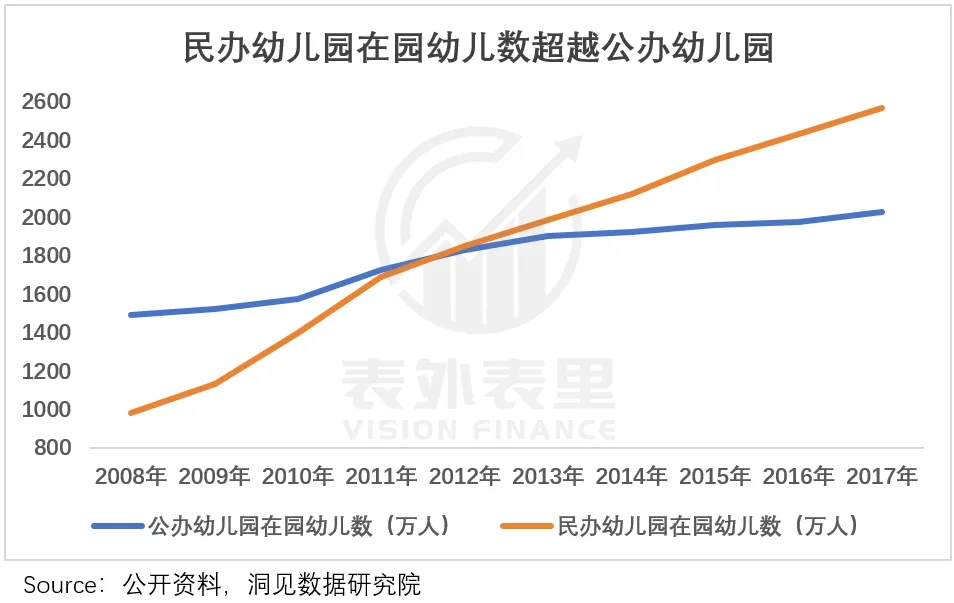 可以看到,民辦幼兒園在園人數不僅超過公辦成為學前教育主體,每年仍以不小的增長狂奔。