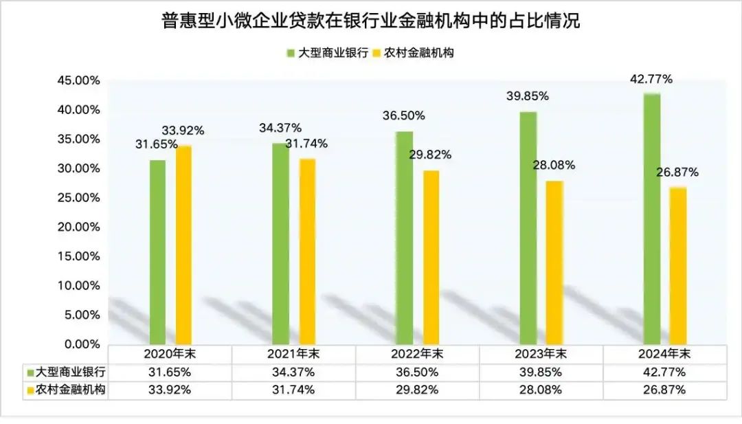 根據金融監管總局發佈的2024年銀行業金融機構普惠型小微企業貸款情況,截至2024年四季度末,同期農村金融機構普惠型小微企業貸款在金融機構中的佔比為26.87%,且從一季度的27.38%逐季下滑,並於四季度末降至27%以下。