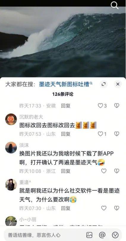 老用户們紛紛跑到社交媒體上瘋狂吐槽,言辭中滿是憤怒與失望。“太醜了,還我以前的墨跡天氣”“嚇我一跳,這黑漆漆的標識,我還以為手機被植入了什麼軟件……”類似的抱怨不絕於耳。有老用户直言“這是對十年感情的背刺”,他們難以接受陪伴自己多年的温暖符號被如此突兀且缺乏美感的標識所取代。