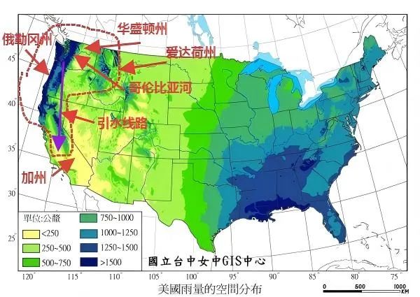 西北的俄勒岡、華盛頓等州,降雨多,而且還有條水量很大的哥倫比亞河。