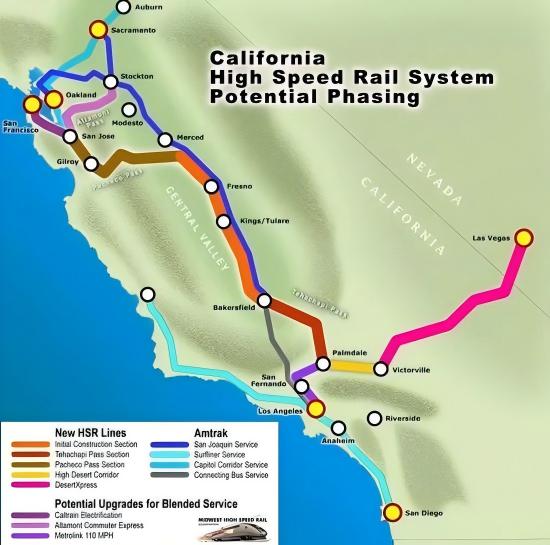 **一期工程:**由安娜海姆(Anaheim)經洛杉磯(Los Angeles)、貝克斯菲爾德(Bakersfield)、馬德拉(Madera)至舊金山(San Francisco)和默賽德(Merced),全程約494英里(795公里)。其中: