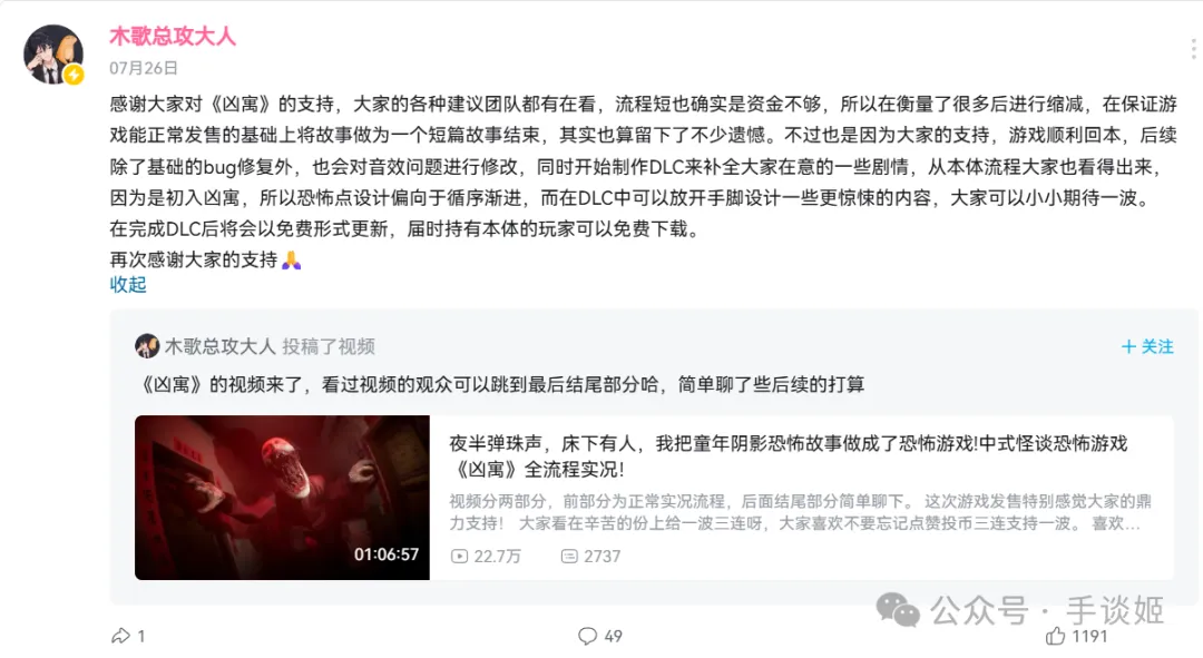 遊戲發售到現在不到20天的時間就已經回本了,足以見得玩家們對這款遊戲的肯定,木歌表示會持續修復一些BUG,並且免費DLC也提上了日程。
