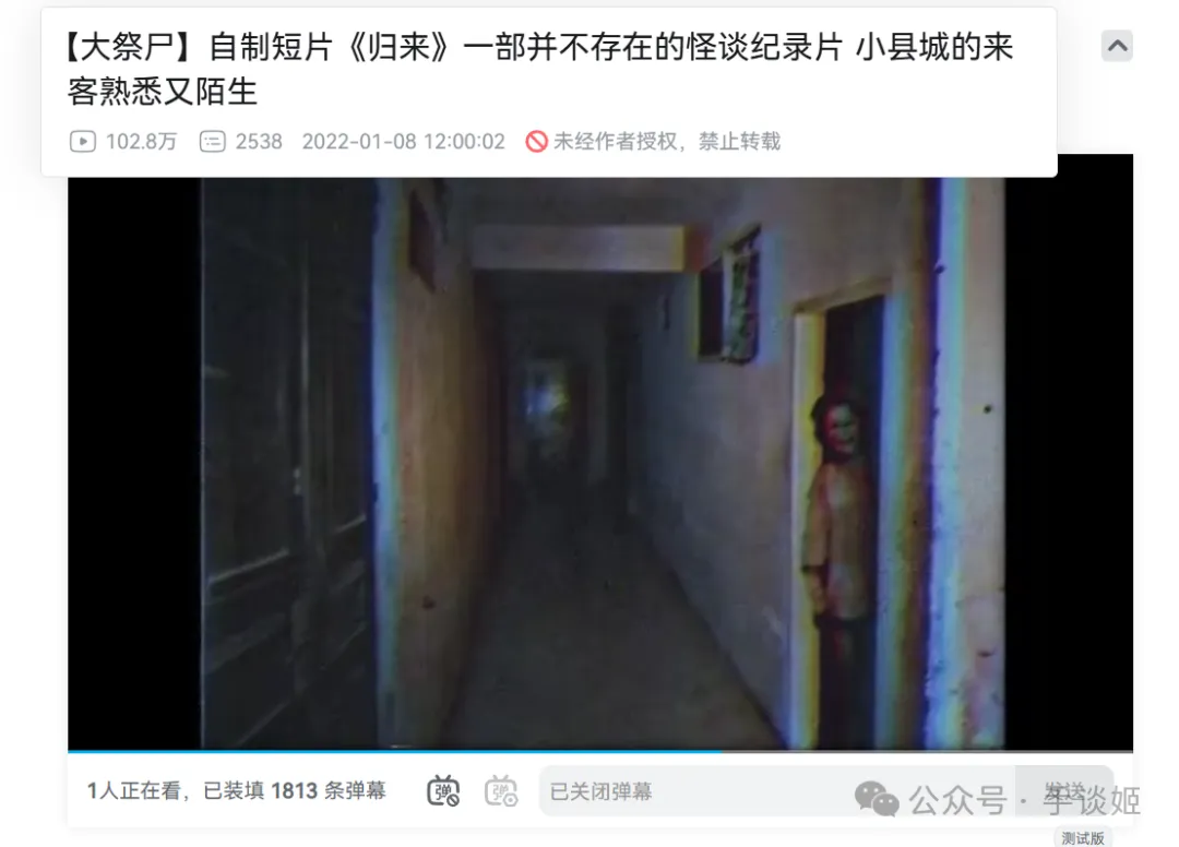 他製作的恐怖短片《歸來》不知道戳中了多少國人內心深處的恐懼,讓許許多多國人看了以後脊背發涼。感覺《兇寓》中的老太太就有點這個視頻中“怪物”的味道。