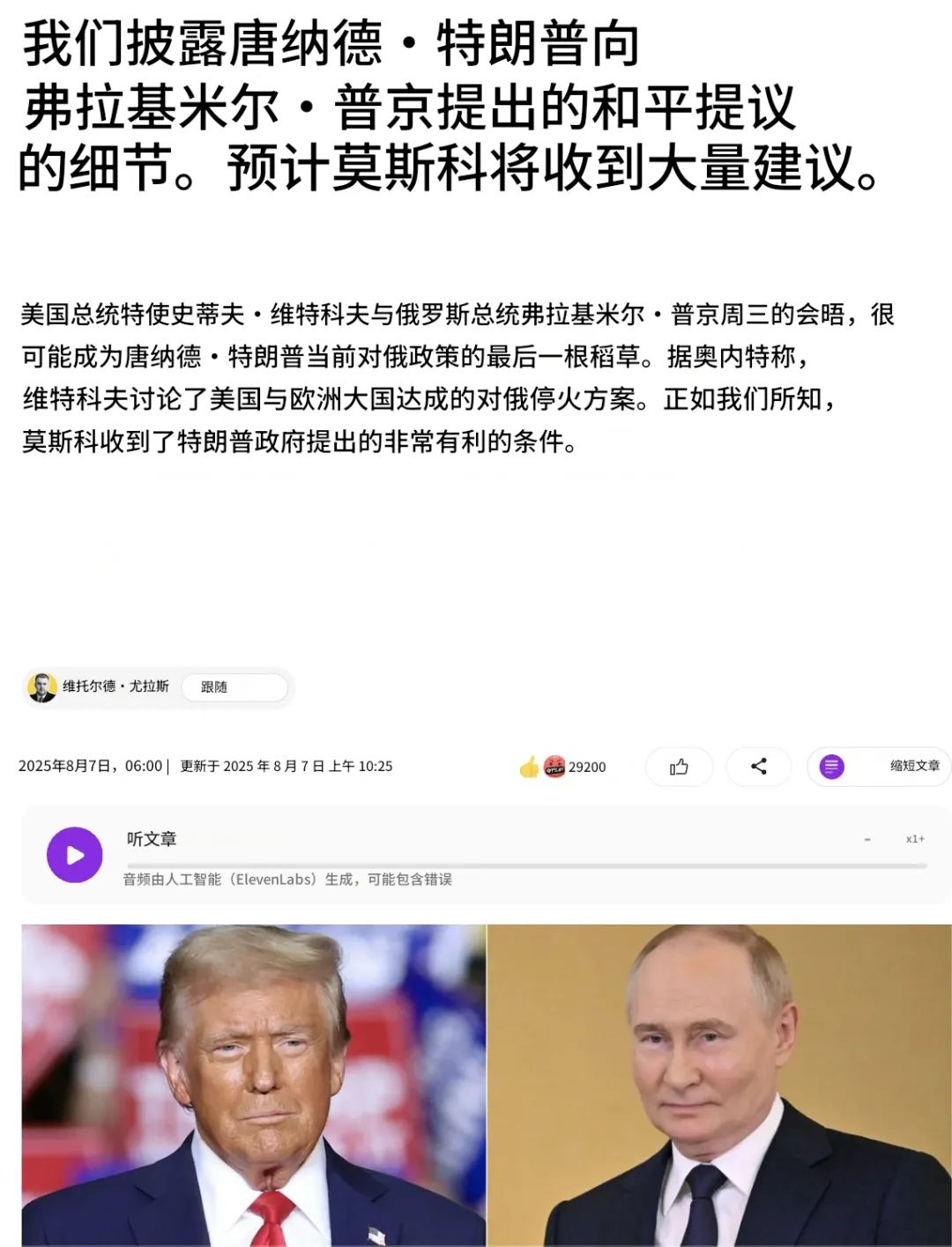 咱們就不多説了,直接開門見山,自威特科夫訪問俄羅斯之後,最近三天美國媒體一直在造勢,甚至歐洲媒體也在造勢。跳的最高的當然是《彭博社》,早在威特科夫訪俄之前,《彭博社》就表示俄羅斯可能讓步,讓步內容是和烏克蘭實現完全的空中停火。