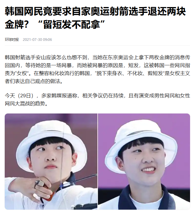 2021年的時候就出現一則新聞:一個女運動員獲得了奧運會金牌,但僅僅只是因為她留了短髮,韓國網友就網暴了她,説她是女權,要求她退還金牌!