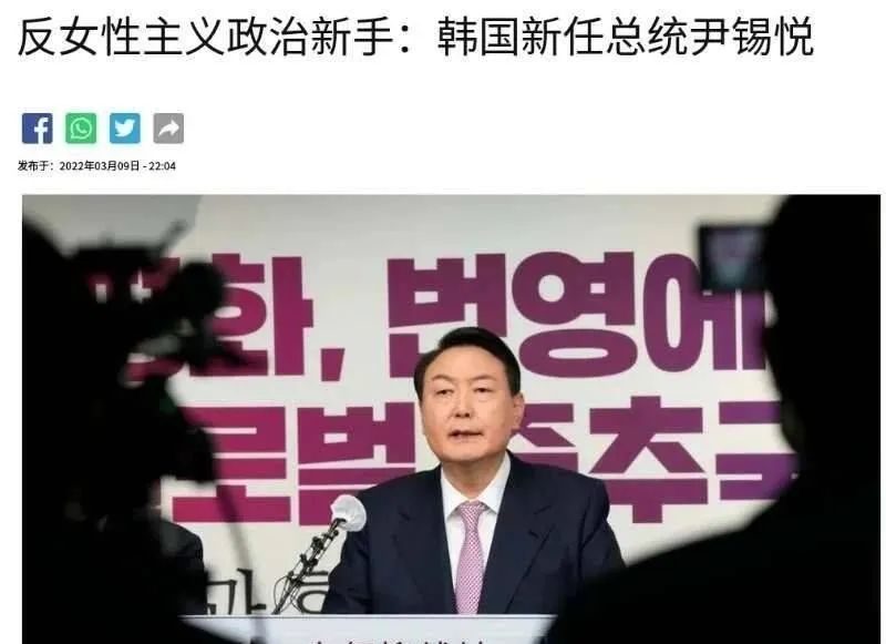 當時,整個西方世界都在批評尹錫悦:France24稱韓國新總統尹錫悦為“反女權政策信徒”;BBC説“厭女症是韓國總統選舉的核心”;vice更直截了當表示韓國新總統完全拒絕女權主義……
