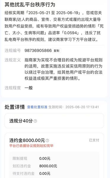 7月27日,河南省的盛世養殖店鋪向“電訴寶”投訴稱平台在無明確違規事實的情況下對其店鋪處以8000元罰款並扣除40分信用分,導致店鋪無法正常經營。