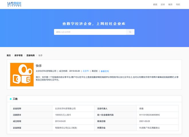 從網經社企業庫瞭解,快手隸屬於北京快手科技有限公司,該公司成立於2015年3月20日,註冊地址為北京市海淀區,法定代表人為銀鑫。