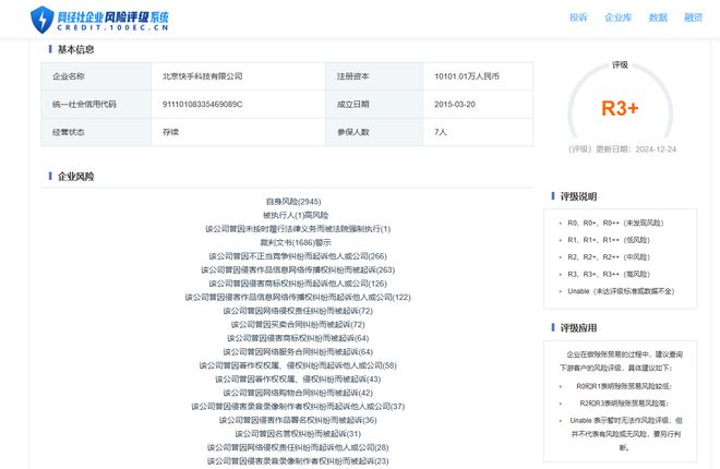 據網經社“企業風險評級系統”顯示,“快手”所屬北京快手科技有限公司的風險評級為R3+,公司目前所處高風險。
