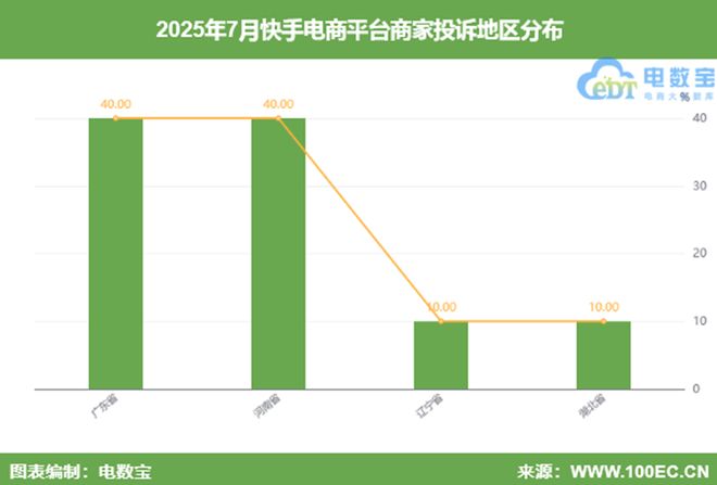 7月,投訴快手電商平台的商家註冊地區TOP4依次為廣東省(40.00%)、河南省(40.00%)、遼寧省(10.00%)、湖北省(10.00%)。