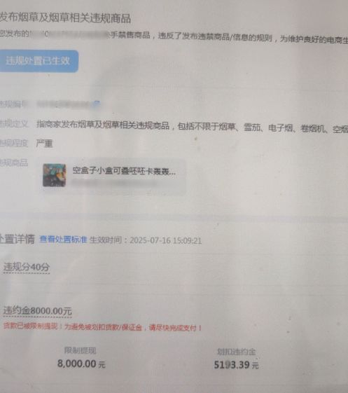 7月17日,遼寧省的鳳的小店店向“電訴寶”投訴稱其因售賣煙盒折卡被平台判定違規並扣除保證金,但質疑處罰依據不明確。商家指出,平台規則僅禁止煙草及直接相關商品,並未明確限制煙盒折卡銷售,且同類商品仍在平台正常售賣。