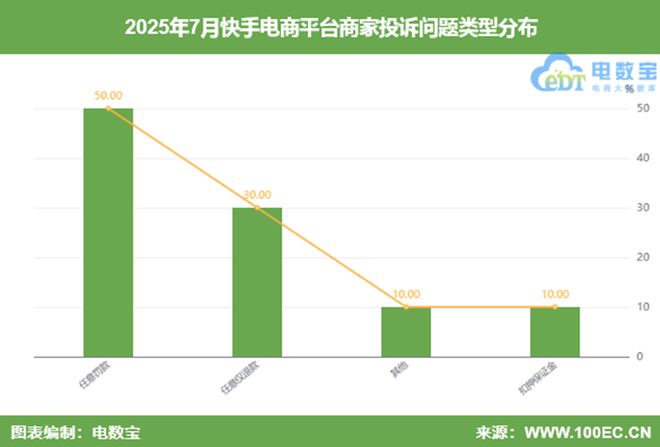 據“電訴寶”顯示,7月快手電商平台涉及的數百份商家投訴,問題類型主要集中在:任意罰款(50.00%)、任意僅退款(30.00%)、扣押保證金(10.00%)、其他(10.00%)。