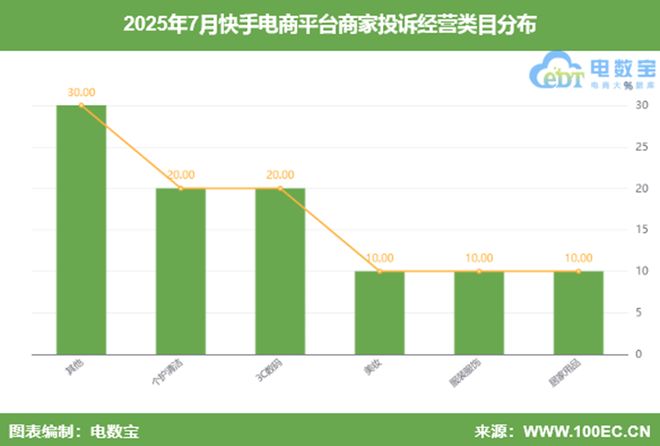 7月,投訴快手電商平台的商家經營類目TOP5依次為個護清潔(20.00%)、3C數碼(20.00%)、美妝(10.00%)、服裝服飾(10.00%)、居家用品(10.00%)。