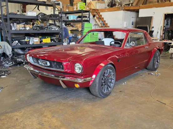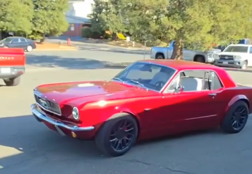 視頻中,這輛雙門野馬轎跑採用了醒目的紅色外觀,其引擎蓋下經過了徹底改造,搭載了特斯拉的全套動力系統以及自動駕駛硬件。