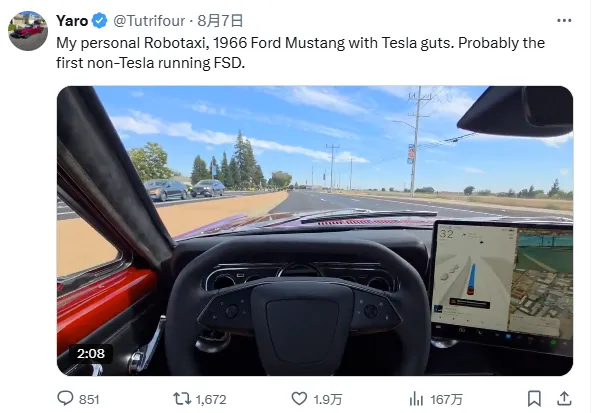當然,老外愛改裝倒不是什麼稀奇事,不過這次不一樣的是,這位“神人”直接把特斯拉 FSD 移植到了 1966 年的福特野馬上。