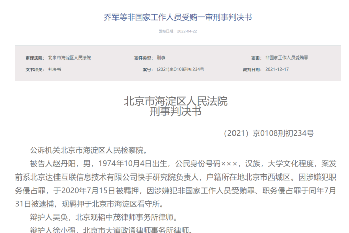 2022年,快手原副總裁趙丹陽獲刑七年。在快手工作時,趙丹陽負責搭建內容審核評級系統,他利用快手內容評級部的職務便利,收受外包公司的好處費,以換取其在內容分發和推薦上的便利。