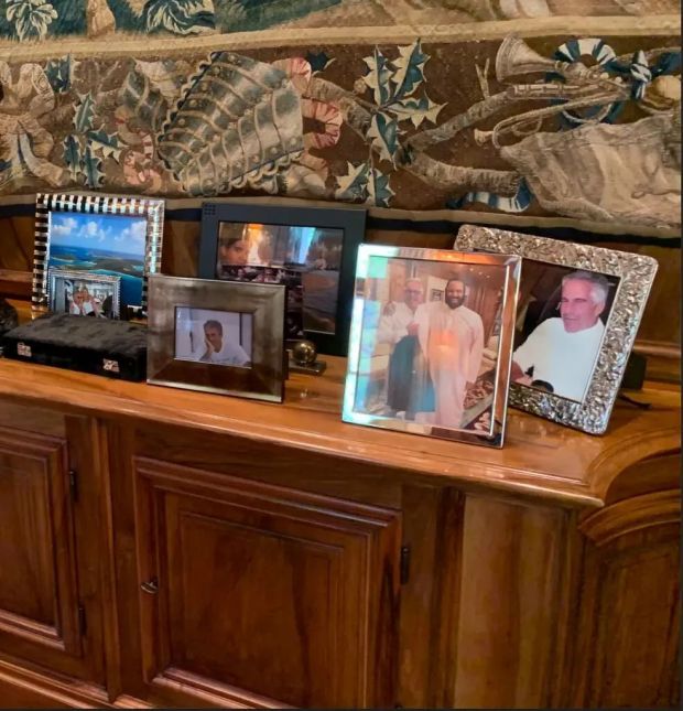 (圖片:愛潑斯坦的豪宅,展示了愛潑斯坦與教皇約翰·保羅二世、米克·賈格爾、埃隆·馬斯克以及菲德爾·卡斯特羅的合影。)