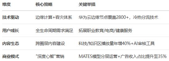 B站的未來可持續發展路徑需要從技術驅動、用户成長、內容生態和商業模式四個維度協同推進。首先,技術驅動是平台穩定發展的基礎。B站應持續優化技術架構,擴大邊緣節點覆蓋,提升平台穩定性和用户體驗。材料顯示,B站已與華為雲合作,在2022年S12賽事中通過邊緣節點實現冷熱分流,降低三四線城市延遲 。未來,B站可以進一步深化與華為雲等供應商的合作,構建更完善的邊緣計算和容災體系。