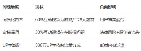 B站內容生態面臨的挑戰是如何在保持高質量內容的同時避免內容同質化。儘管B站已從二次元垂類社區發展為覆蓋多元興趣圈層的平台,但內容同質化現象仍然存在。據統計,B站互動視頻板塊中超過60%的內容屬於遊戲直播、二次元動漫等熱門題材,而其他領域的創新內容相對較少,導致用户在瀏覽過程中容易產生審美疲勞 。同時,內容質量參差不齊,部分創作者為追求流量而犧牲內容質量,甚至包含低俗暴力或不適宜的內容,損害了平台形象並影響未成年用户。